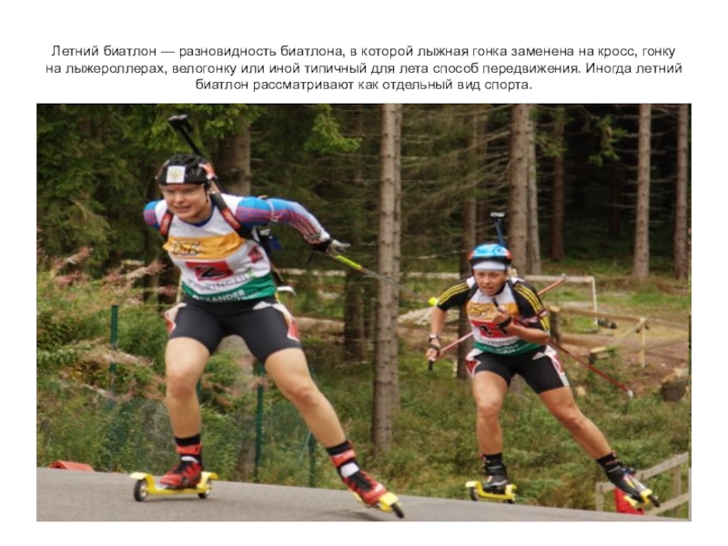 Слайд 14Летний биатлон — разновидность биатлона, в которой лыжная гонка заменена на