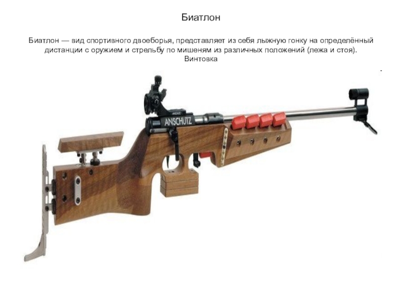 Биатлон  Биатлон — вид спортивного двоеборья, представляет из себя лыжную гонку на определённый дистанции с оружием