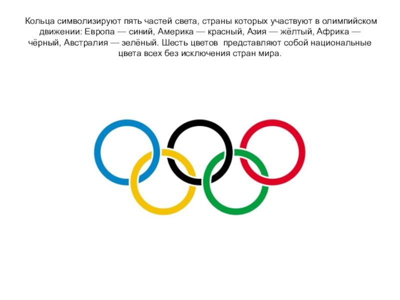 Слайд 2Кольца символизируют пять частей света, страны которых участвуют в олимпийском движении: