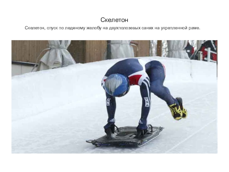 Слайд 15 Скелетон Скелетон, спуск по ледяному желобу на двухполозевых санях на укрепленной