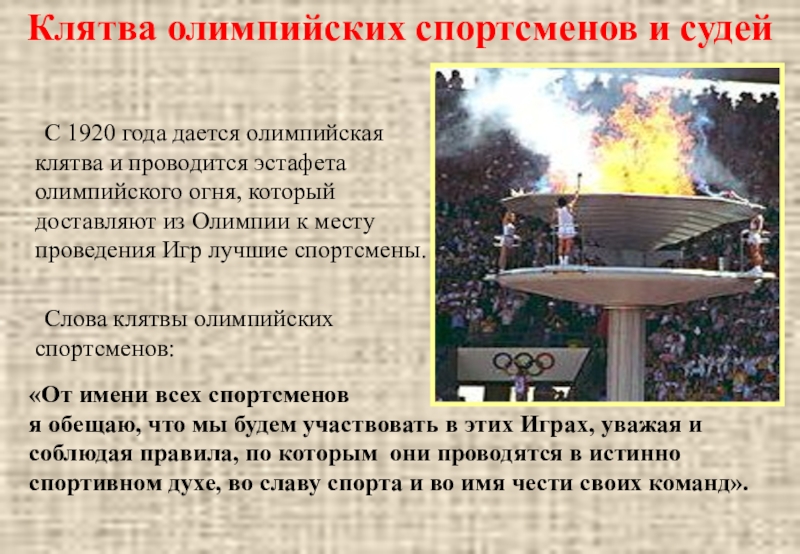 я обещаю, что мы будем участвовать в этих Играх, уважая и соблюдая правила, по которым они проводятся в истинно спортивном духе, во славу спорта и во имя чести своих команд».