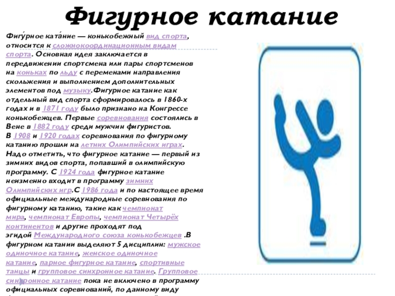 заключается в передвижении спортсмена или пары спортсменов на коньках по льду с переменами направления скольжения и выполнением дополнительных элементов под музыку.Фигурное катание как отдельный вид спорта сформировалось в 1860-х годах и в 1871 году было признано на Конгрессе конькобежцев. Первые соревнования состоялись в Вене в 1882 году среди мужчин фигуристов.В 1908 и 1920 годах соревнования по фигурному катанию прошли на летних Олимпийских играх. Надо отметить, что фигурное катание — первый из зимних видов спорта, попавший в олимпийскую программу. С 1924 года фигурное катание неизменно входит в программу зимних Олимпийских игр.C 1986 года и по настоящее время официальные международные соревнования по фигурному катанию, такие как чемпионат мира, чемпионат Европы, чемпионат Четырёх континентов и другие проходят под эгидой Международного союза конькобежцев .В фигурном катании выделяют 5 дисциплин: мужское одиночное катание, женское одиночное катание, парное фигурное катание, спортивные танцы и групповое синхронное катание. Групповое синхронное катание пока не включено в программу официальных соревнований, по данному виду фигурного катания проходит отдельный чемпионат .