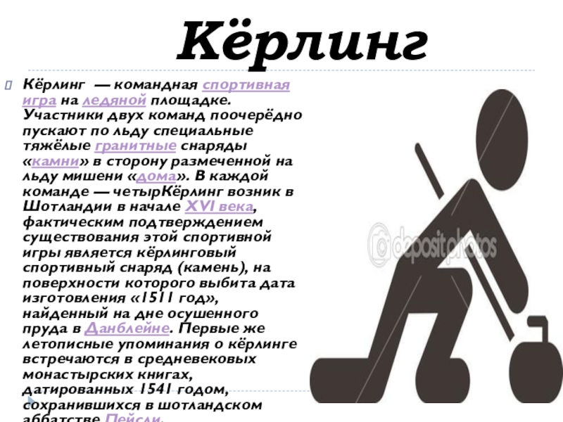 специальные тяжёлые гранитные снаряды «камни» в сторону размеченной на льду мишени «дома». В каждой команде — четырКёрлинг возник в Шотландии в начале XVI века, фактическим подтверждением существования этой спортивной игры является кёрлинговый спортивный снаряд (камень), на поверхности которого выбита дата изготовления «1511 год», найденный на дне осушенного пруда в Данблейне. Первые же летописные упоминания о кёрлинге встречаются в средневековых монастырских книгах, датированных 1541 годом, сохранившихся в шотландском аббатстве Пейсли.