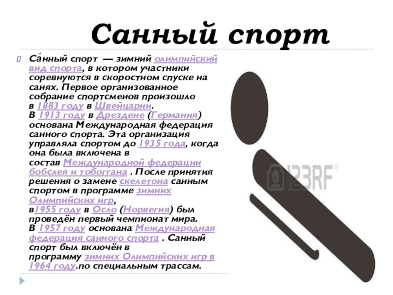 в скоростном спуске на санях. Первое организованное собрание спортсменов произошло в 1883 году в Швейцарии. В 1913 году в Дрездене (Германия) основана Международная федерация санного спорта. Эта организация управляла спортом до 1935 года, когда она была включена в состав Международной федерации бобслея и тобоггана . После принятия решения о замене скелетона санным спортом в программе зимних Олимпийских игр, в1955 году в Осло (Норвегия) был проведён первый чемпионат мира. В 1957 году основана Международная федерация санного спорта . Санный спорт был включён в программу зимних Олимпийских игр в 1964 году.по специальным трассам.
