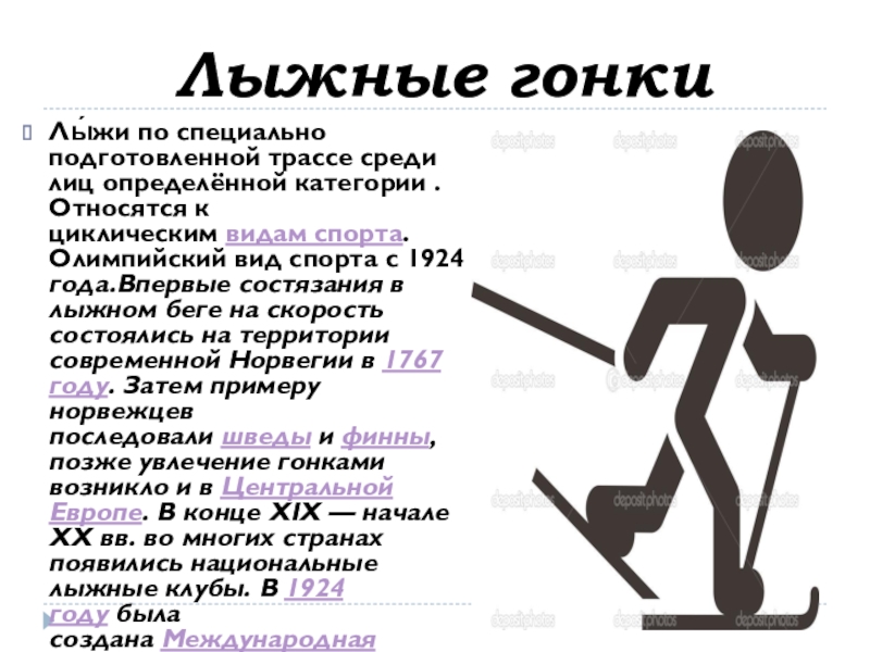 . Относятся к циклическим видам спорта. Олимпийский вид спорта с 1924 года.Впервые состязания в лыжном беге на скорость состоялись на территории современной Норвегии в 1767 году. Затем примеру норвежцев последовали шведы и финны, позже увлечение гонками возникло и в Центральной Европе. В конце XIX — начале XX вв. во многих странах появились национальные лыжные клубы. В 1924 году была создана Международная федерация лыжного спорта (. В 2000 насчитывала 98 национальных федераций.