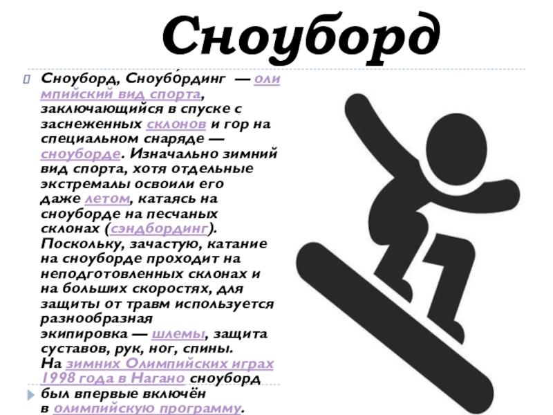 Сноуборд, Сноубо́рдинг — олимпийский вид спорта, заключающийся в спуске с заснеженных склонов и гор на
