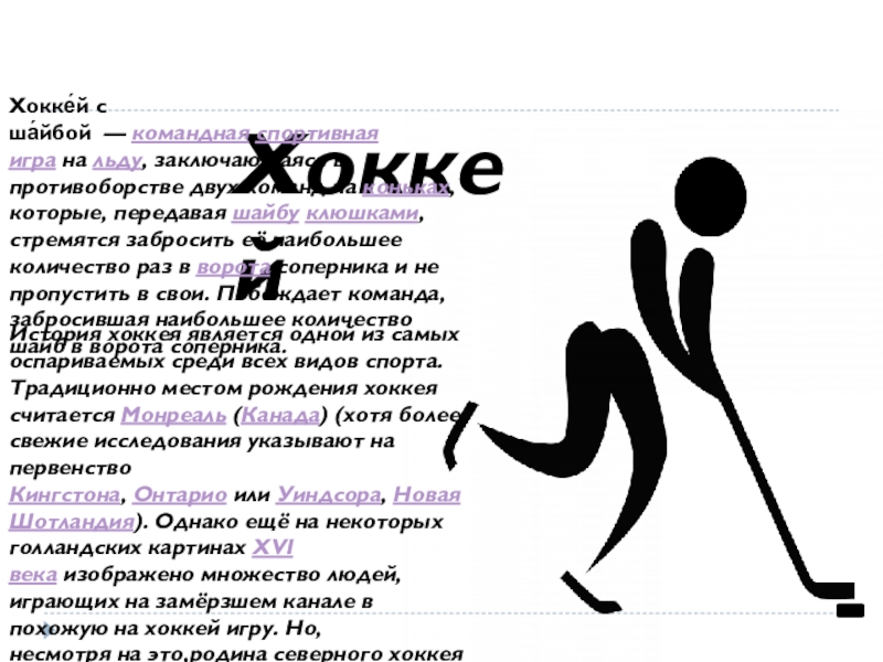 Хокке́й с ша́йбой — командная спортивная игра на льду, заключающаяся в противоборстве двух команд на коньках,