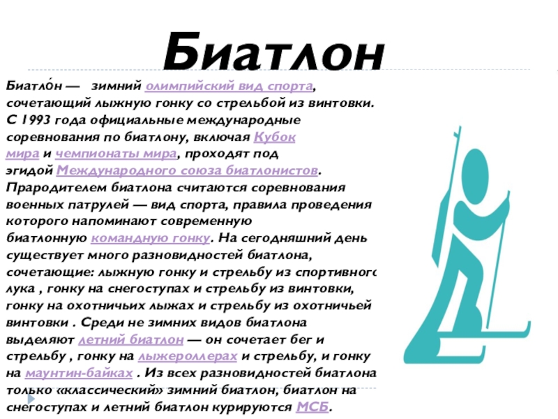 Прародителем биатлона считаются соревнования военных патрулей — вид спорта, правила проведения которого напоминают современную биатлонную командную гонку. На сегодняшний день существует много разновидностей биатлона, сочетающие: лыжную гонку и стрельбу из спортивного лука , гонку на снегоступах и стрельбу из винтовки, гонку на охотничьих лыжах и стрельбу из охотничьей винтовки . Среди не зимних видов биатлона выделяют летний биатлон — он сочетает бег и стрельбу , гонку на лыжероллерах и стрельбу, и гонку на маунтин-байках . Из всех разновидностей биатлона только «классический» зимний биатлон, биатлон на снегоступах и летний биатлон курируются МСБ.