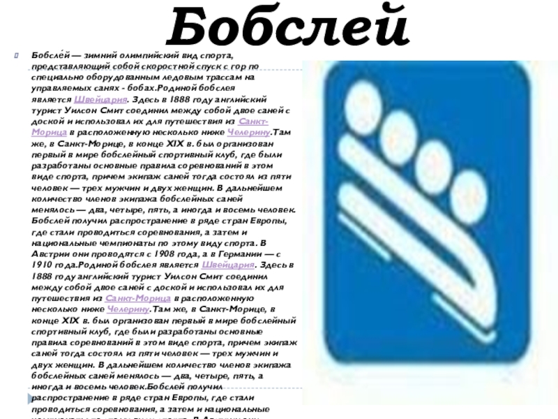 гор по специально оборудованным ледовым трассам на управляемых санях - бобах.Родиной бобслея является Швейцария. Здесь в 1888 году английский турист Уилсон Смит соединил между собой двое саней с доской и использовал их для путешествия из Санкт-Морица в расположенную несколько ниже Челерину.Там же, в Санкт-Морице, в конце XIX в. был организован первый в мире бобслейный спортивный клуб, где были разработаны основные правила соревнований в этом виде спорта, причем экипаж саней тогда состоял из пяти человек — трех мужчин и двух женщин. В дальнейшем количество членов экипажа бобслейных саней менялось — два, четыре, пять, а иногда и восемь человек.Бобслей получил распространение в ряде стран Европы, где стали проводиться соревнования, а затем и национальные чемпионаты по этому виду спорта. В Австрии они проводятся с 1908 года, а в Германии — с 1910 года.Родиной бобслея является Швейцария. Здесь в 1888 году английский турист Уилсон Смит соединил между собой двое саней с доской и использовал их для путешествия из Санкт-Морица в расположенную несколько ниже Челерину.Там же, в Санкт-Морице, в конце XIX в. был организован первый в мире бобслейный спортивный клуб, где были разработаны основные правила соревнований в этом виде спорта, причем экипаж саней тогда состоял из пяти человек — трех мужчин и двух женщин. В дальнейшем количество членов экипажа бобслейных саней менялось — два, четыре, пять, а иногда и восемь человек.Бобслей получил распространение в ряде стран Европы, где стали проводиться соревнования, а затем и национальные чемпионаты по этому виду спорта. В Австрии они проводятся с 1908 года, а в Германии — с 1910 года.