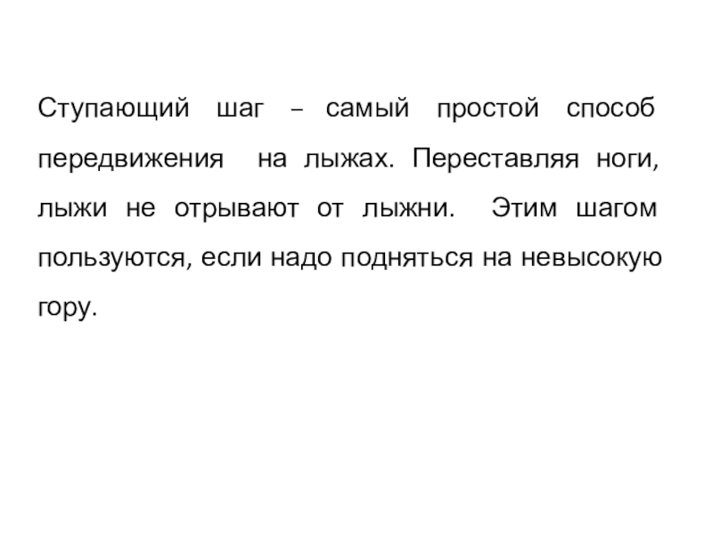 Слайд 4Ступающий шаг – самый простой способ передвижения на лыжах. Переставляя ноги,