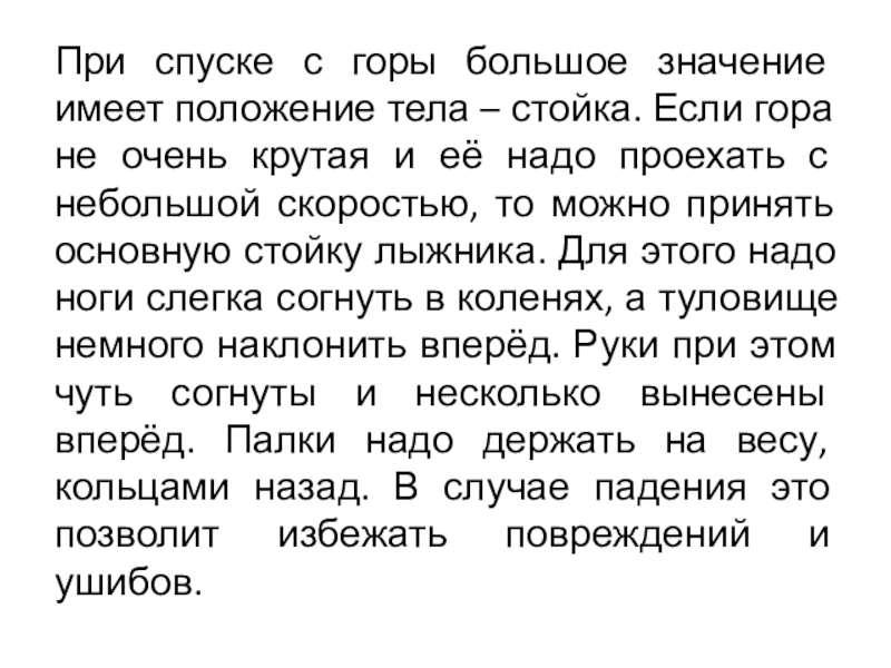 При спуске с горы большое значение имеет положение тела – стойка. Если гора не очень крутая и