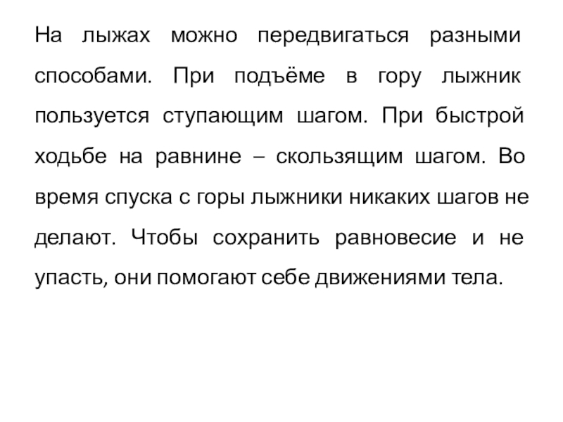 На лыжах можно передвигаться разными способами. При подъёме в гору лыжник пользуется ступающим шагом. При быстрой ходьбе на равнине – скользящим шагом. Во время спуска с горы лыжники никаких шагов не делают. Чтобы сохранить равновесие и
