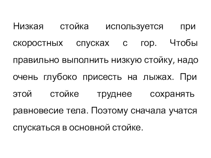 Слайд 10Низкая стойка используется при скоростных спусках с гор. Чтобы правильно выполнить
