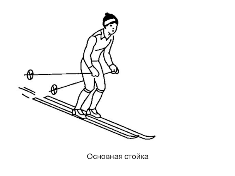 низкую стойку, надо очень глубоко присесть на лыжах. При этой стойке труднее сохранять равновесие тела. Поэтому сначала учатся спускаться в основной стойке.