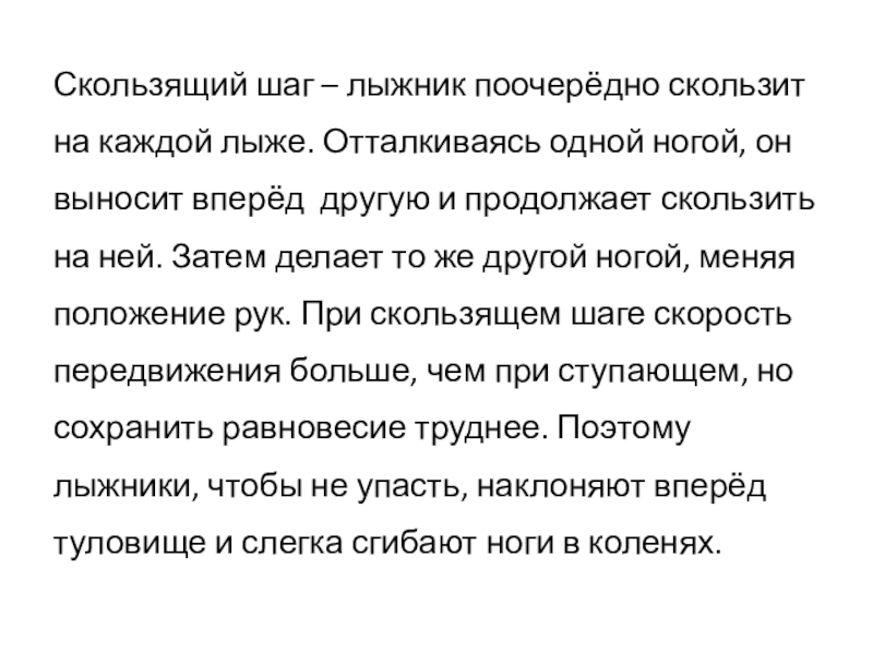 ногой, он выносит вперёд другую и продолжает скользить на ней. Затем делает то же другой ногой, меняя положение рук. При скользящем шаге скорость передвижения больше, чем при ступающем, но сохранить равновесие труднее. Поэтому лыжники, чтобы не упасть, наклоняют вперёд туловище и слегка сгибают ноги в коленях.