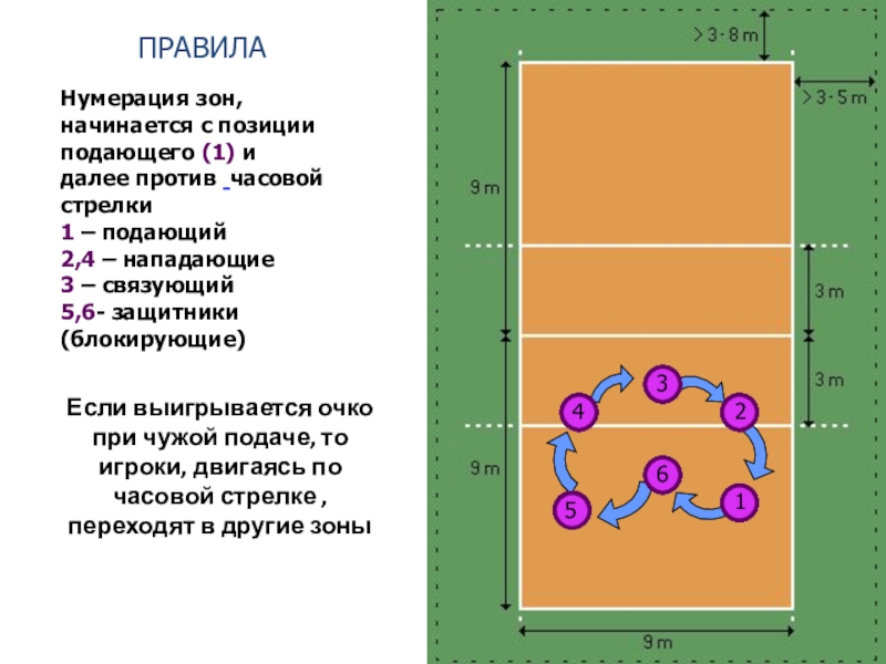 Нумерация зон, начинается с позиции подающего (1) и далее против часовой стрелки