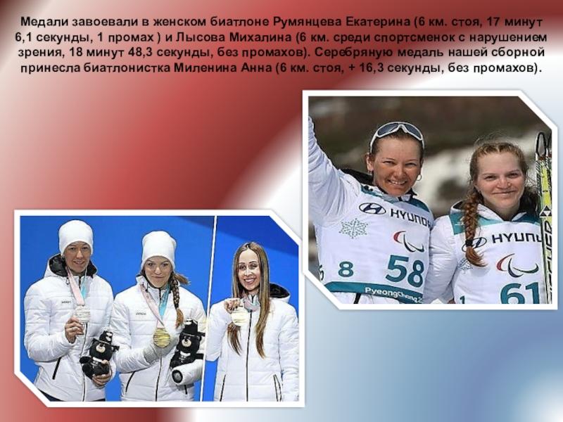 минут 6,1 секунды, 1 промах ) и Лысова Михалина (6 км. среди спортсменок с нарушением зрения, 18 минут 48,3 секунды, без промахов). Серебряную медаль нашей сборной принесла биатлонистка Миленина Анна (6 км. стоя, + 16,3 секунды, без промахов).