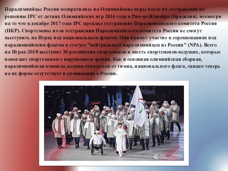 IPC от летних Олимпийских игр 2016 года в Рио-де-Жанейро (Бразилия), несмотря на то что в декабре 2017 года IPC продлил отстранение Паралимпийского комитета России (ПКР). Спортсмены из-за отстранения Паралимпийского комитета России не смогут выступить на Играх под национальным флагом. Они примут участие в соревнованиях под паралимпийским флагом в статусе "нейтральных паралимпийцев из России" (NPA). Всего на Играх-2018 выступят 30 российских спортсменов и шесть спортсменов-ведущих, которые помогают спортсменам с нарушением зрения. Как и основная олимпийская сборная, паралимпийская команда должна отказаться от гимна, национального флага, однако теперь на их форме отсутствует и упоминание о России.