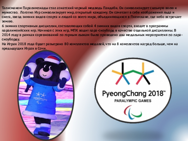 Слайд 5Талисманом Паралимпиады стал азиатский черный медведь Пандаби. Он символизирует сильную волю
