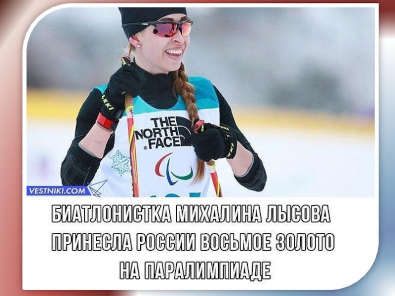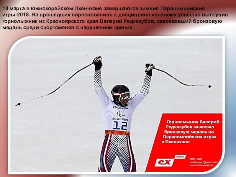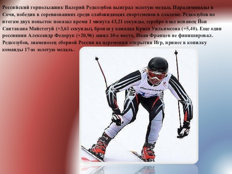 Слайд 18Российский горнолыжник Валерий Редкозубов выиграл золотую медаль Паралимпиады в Сочи, победив