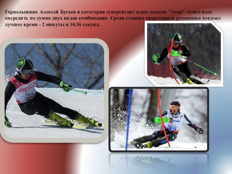 Слайд 13Горнолыжник Алексей Бугаев в категории супергигант плюс слалом "стоя" сумел всех