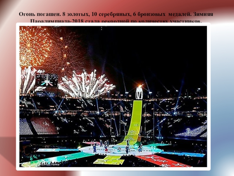 Слайд 22Огонь погашен. 8 золотых, 10 серебряных, 6 бронзовых медалей. Зимняя Паралимпиада-2018
