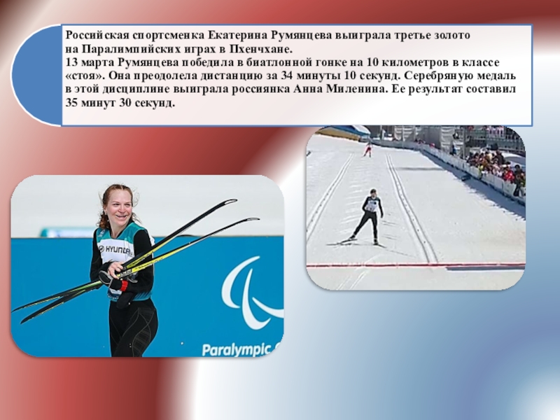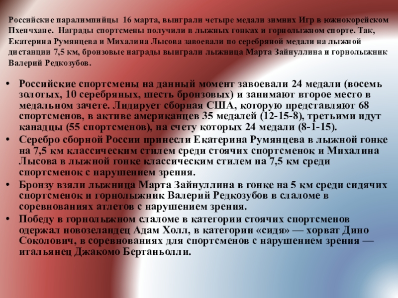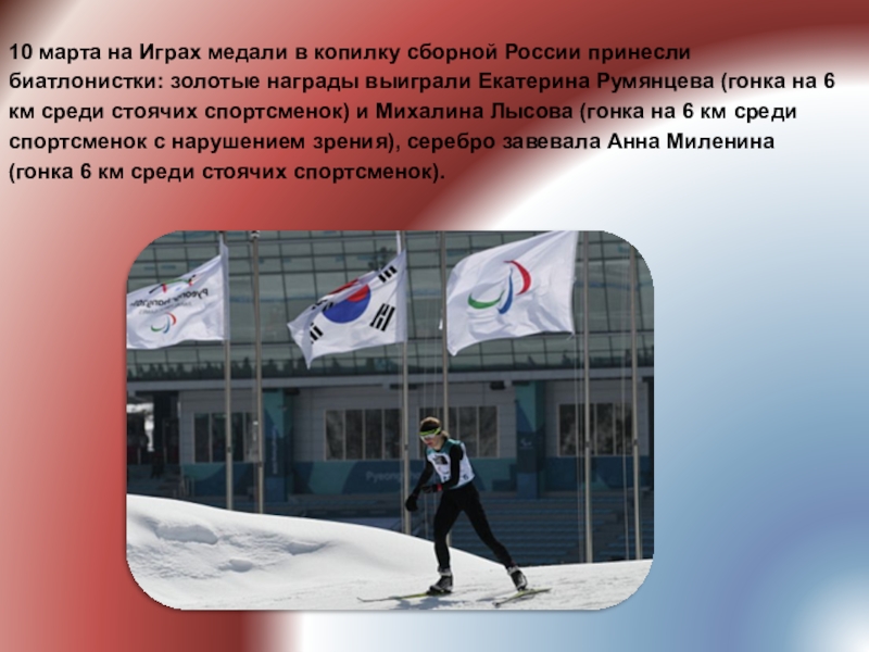 Слайд 19Российские паралимпийцы 16 марта, выиграли четыре медали зимних Игр в южнокорейском