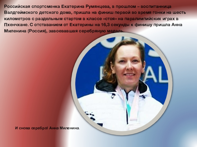 Слайд 11Российская спортсменка Екатерина Румянцева, в прошлом – воспитанница Валдгеймского детского дома,