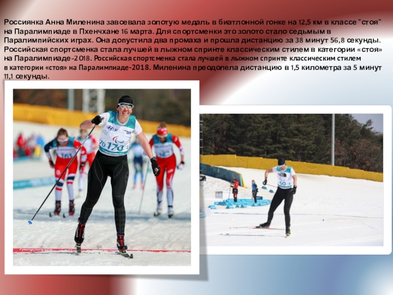в классе "стоя" на Паралимпиаде в Пхенчхане 16 марта. Для спортсменки это золото стало седьмым в Паралимпийских играх. Она допустила два промаха и прошла дистанцию за 38 минут 56,8 секунды. Российская спортсменка стала лучшей в лыжном спринте классическим стилем в категории «стоя» на Паралимпиаде-2018. Российская спортсменка стала лучшей в лыжном спринте классическим стилем в категории «стоя» на Паралимпиаде-2018. Миленина преодолела дистанцию в 1,5 километра за 5 минут 11,1 секунды.