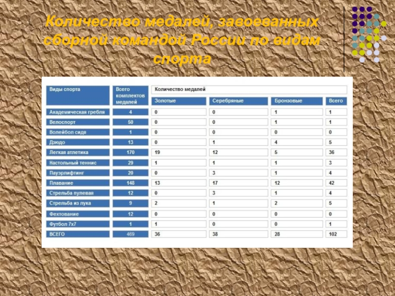 Количество медалей, завоеванных сборной командой России по видам спорта