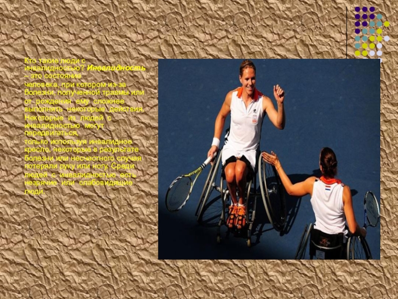 Слайд 3Кто такие люди с инвалидностью? Инвалидность – это состояние