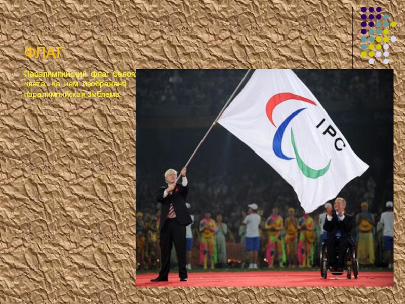 Паралимпийский флаг белого цвета, на нем изображена
