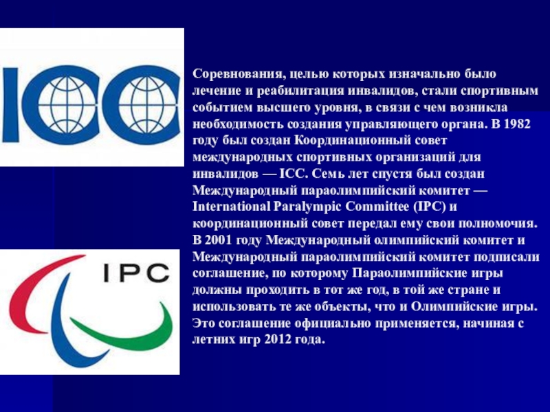событием высшего уровня, в связи с чем возникла необходимость создания управляющего органа. В 1982 году был создан Координационный совет международных спортивных организаций для инвалидов — ICC. Семь лет спустя был создан Международный параолимпийский комитет — International Paralympic Committee (IPC) и координационный совет передал ему свои полномочия.