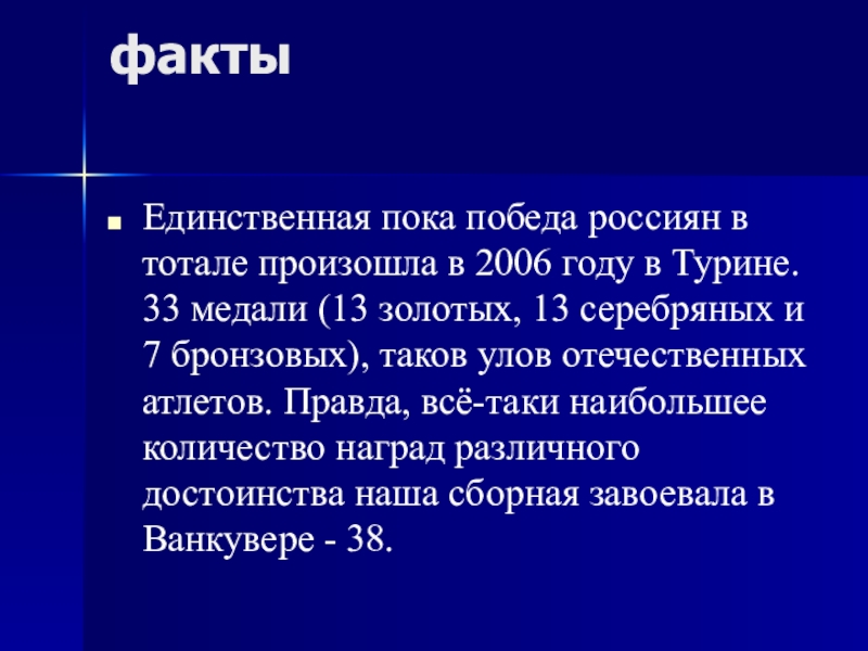 Турине. 33 медали (13 золотых, 13 серебряных и 7 бронзовых), таков улов отечественных атлетов. Правда, всё-таки наибольшее количество наград различного достоинства наша сборная завоевала в Ванкувере - 38.