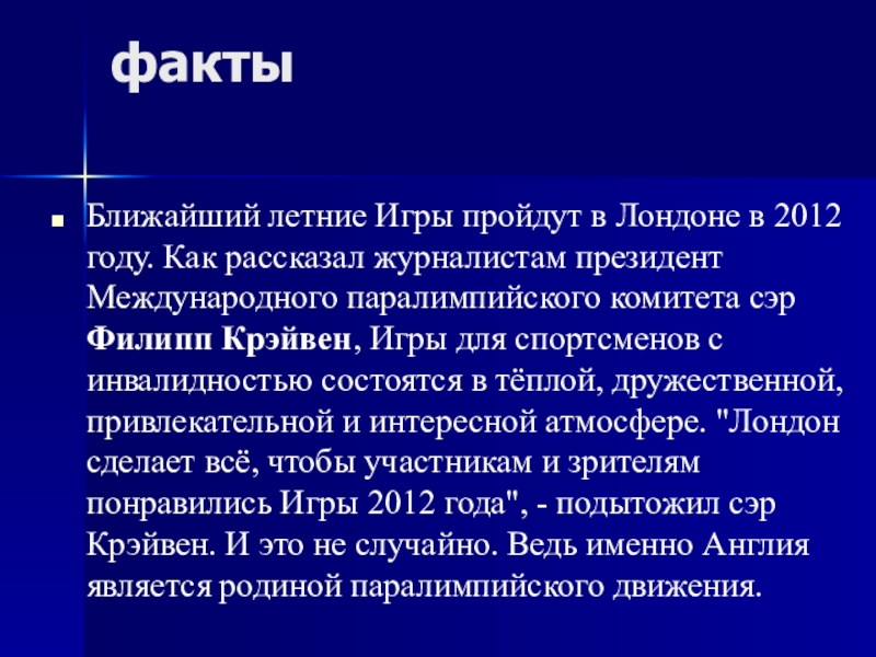 журналистам президент Международного паралимпийского комитета сэр Филипп Крэйвен, Игры для спортсменов с инвалидностью состоятся в тёплой, дружественной, привлекательной и интересной атмосфере. "Лондон сделает всё, чтобы участникам и зрителям понравились Игры 2012 года", - подытожил сэр Крэйвен. И это не случайно. Ведь именно Англия является родиной паралимпийского движения.