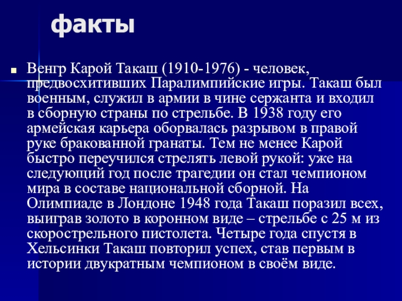 Венгр Карой Такаш (1910-1976) - человек, предвосхитивших Паралимпийские игры. Такаш был