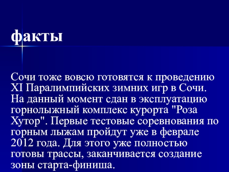 в Сочи. На данный момент сдан в эксплуатацию горнолыжный комплекс курорта "Роза Хутор". Первые тестовые соревнования по горным лыжам пройдут уже в феврале 2012 года. Для этого уже полностью готовы трассы, заканчивается создание зоны старта-финиша.