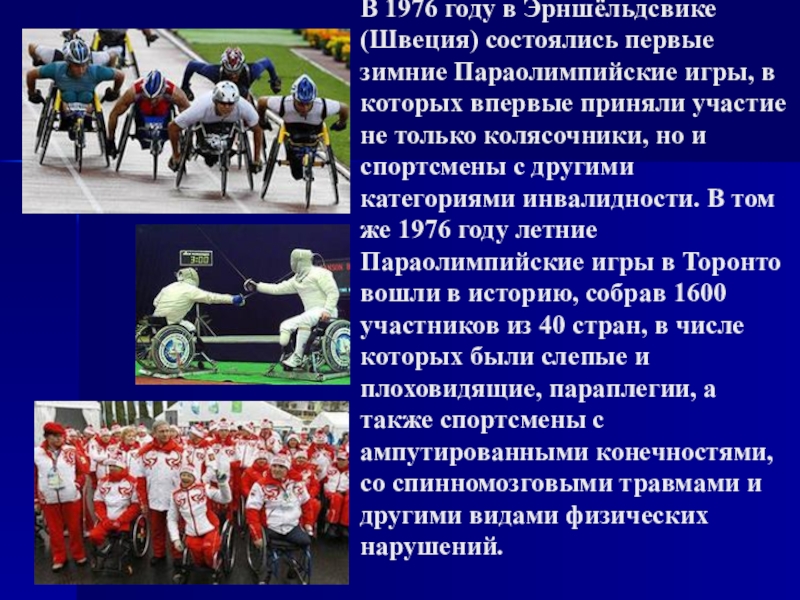 Слайд 4В 1976 году в Эрншёльдсвике (Швеция) состоялись первые зимние Параолимпийские игры,