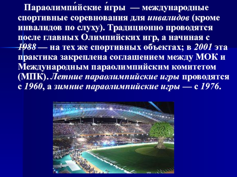 (кроме инвалидов по слуху). Традиционно проводятся после главных Олимпийских игр, а начиная с 1988 — на тех же спортивных объектах; в 2001 эта практика закреплена соглашением между МОК и Международным параолимпийским комитетом (МПК). Летние параолимпийские игры проводятся с 1960, а зимние параолимпийские игры — с 1976.