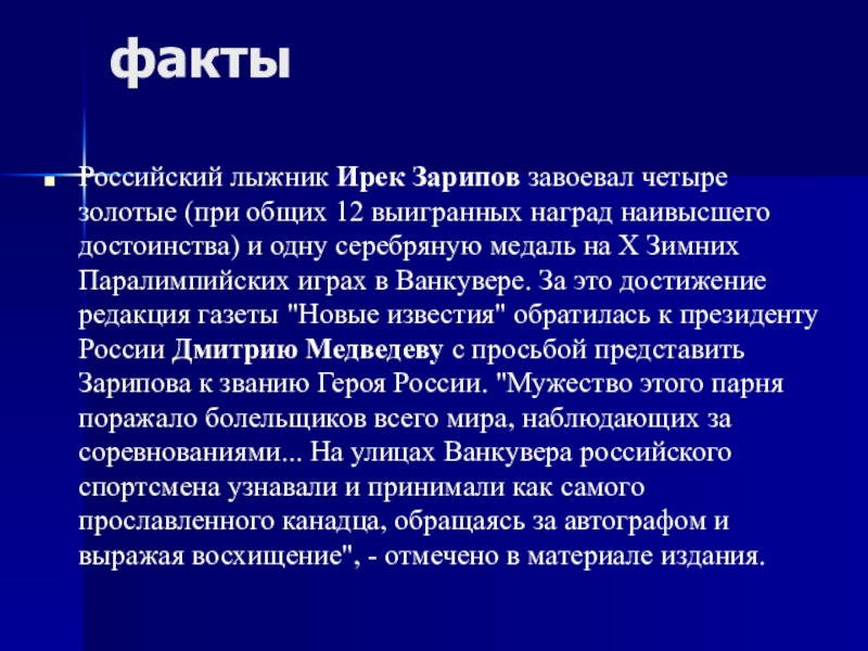 наград наивысшего достоинства) и одну серебряную медаль на Х Зимних Паралимпийских играх в Ванкувере. За это достижение редакция газеты "Новые известия" обратилась к президенту России Дмитрию Медведеву с просьбой представить Зарипова к званию Героя России. "Мужество этого парня поражало болельщиков всего мира, наблюдающих за соревнованиями... На улицах Ванкувера российского спортсмена узнавали и принимали как самого прославленного канадца, обращаясь за автографом и выражая восхищение", - отмечено в материале издания.