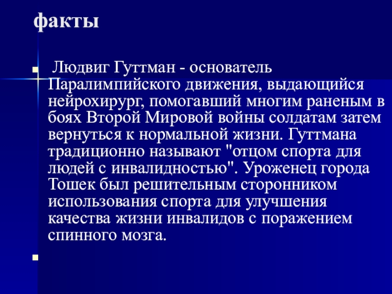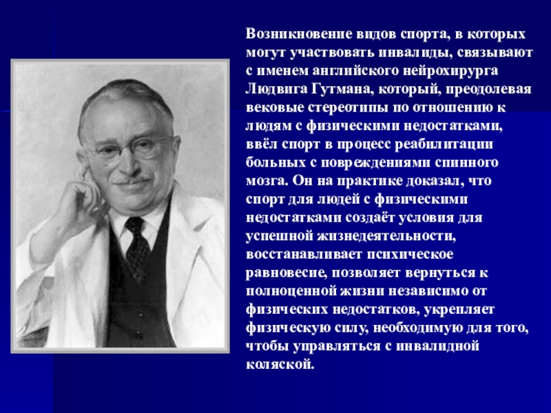 английского нейрохирурга Людвига Гутмана, который, преодолевая вековые стереотипы по отношению к людям с физическими недостатками, ввёл спорт в процесс реабилитации больных с повреждениями спинного мозга. Он на практике доказал, что спорт для людей с физическими недостатками создаёт условия для успешной жизнедеятельности, восстанавливает психическое равновесие, позволяет вернуться к полноценной жизни независимо от физических недостатков, укрепляет физическую силу, необходимую для того, чтобы управляться с инвалидной коляской.