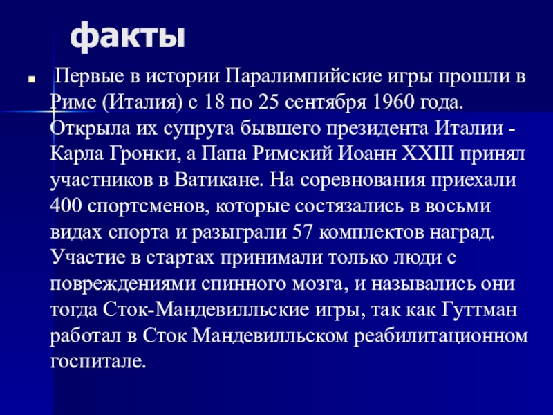 Слайд 5Соревнования, целью которых изначально было лечение и реабилитация инвалидов, стали спортивным