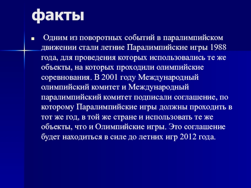 игры 1988 года, для проведения которых использовались те же объекты, на которых проходили олимпийские соревнования. В 2001 году Международный олимпийский комитет и Международный паралимпийский комитет подписали соглашение, по которому Паралимпийские игры должны проходить в тот же год, в той же стране и использовать те же объекты, что и Олимпийские игры. Это соглашение будет находиться в силе до летних игр 2012 года.