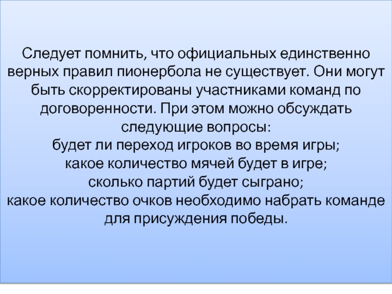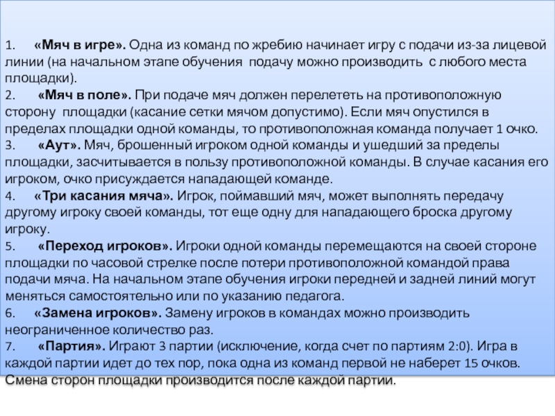 Дети становятся в круг на расстоянии вытянутой руки друг от друга. По свистку они выполняют быстрые передачи мяча друг другу (кроме соседних игроков) любым способом. Если игрок долго держит мяч (по усмотрению судьи), то он выбывает из игры (раздается свисток и судья показывает жест - согнутые руки подняты вверх ладонями к лицу). Игра идет до тех пор, пока не останется один ловкий игрок (жест судьи в сторону победителя). Окончание игры сопровождается продолжительным свисток и жестом скрещение рук над головой.