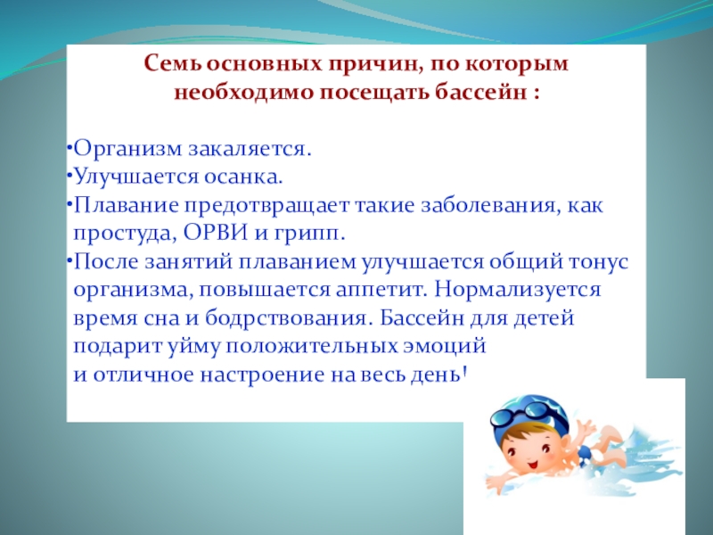 Семь основных причин, по которым необходимо посещать бассейн :Организм закаляется.Улучшается осанка.Плавание предотвращает такие заболевания, как простуда, ОРВИ и