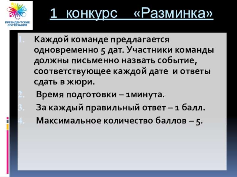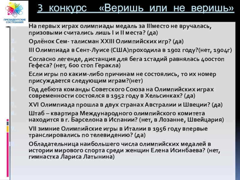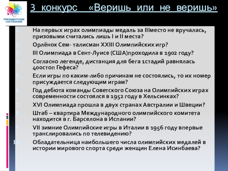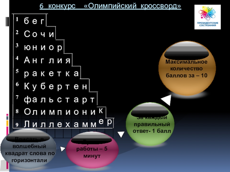 Правильный ответ – 1 балл. Максимальное количество баллов за конкурс – 10.