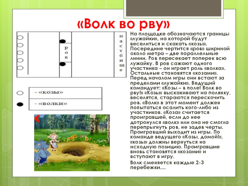 и скакать «козы». Посередине чертится «ров» шириной около метра – две параллельные линии. Ров пересекает поперек всю лужайку. В ров сажают одного участника – он играет роль «волка». Остальные становятся «козами». Перед началом игры они встают за пределами «лужайки». Ведущий командует: «Козы – в поле! Волк во рву!» «Козы» выскакивают на полянку, веселятся, стараются перескочить ров. «Волк» в этот момент должен попытаться осалить кого-либо из участников. «Коза» считается проигравшей, если до нее дотронулся «волк» или она не смогла перепрыгнуть ров, не задев черты. Проигравший выходит из игры. По команде ведущего «Козы, домой!», «козы» должны вернуться на исходную позицию. Проигравшие вновь становятся «козами» и вступают в игру.