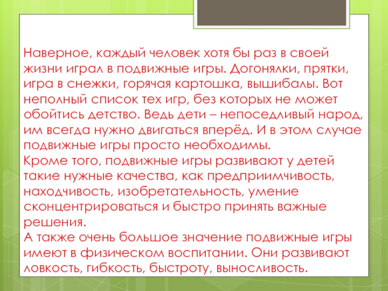 А также очень большое значение подвижные игры имеют в физическом воспитании. Они развивают ловкость, гибкость, быстроту, выносливость.