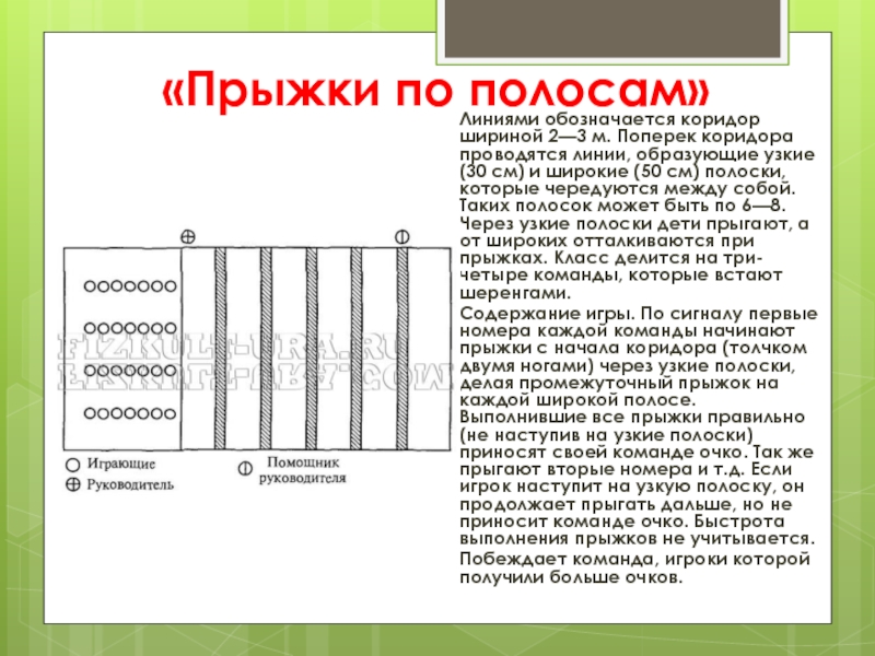 Содержание игры. По сигналу первые номера каждой команды начинают прыжки с начала коридора (толчком двумя ногами) через узкие полоски, делая промежуточный прыжок на каждой широкой полосе. Выполнившие все прыжки правильно (не наступив на узкие полоски) приносят своей команде очко. Так же прыгают вторые номера и т.д. Если игрок наступит на узкую полоску, он продолжает прыгать дальше, но не приносит команде очко. Быстрота выполнения прыжков не учитывается.
