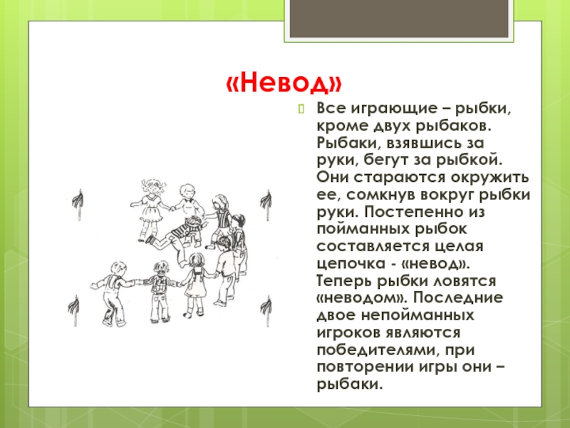 бегут за рыбкой. Они стараются окружить ее, сомкнув вокруг рыбки руки. Постепенно из пойманных рыбок составляется целая цепочка - «невод». Теперь рыбки ловятся «неводом». Последние двое непойманных игроков являются победителями, при повторении игры они – рыбаки.